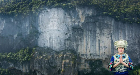 景區內坐落著一座巨大的觀音摩崖像,這尊觀音像像高123米,寬69米,是目前世界最高的觀音雕像。觀音手執凈瓶柳枝,端坐蓮臺,指灑圣水,面目和祥。傳聞對著觀音像虔誠的許下心愿,就能實現。