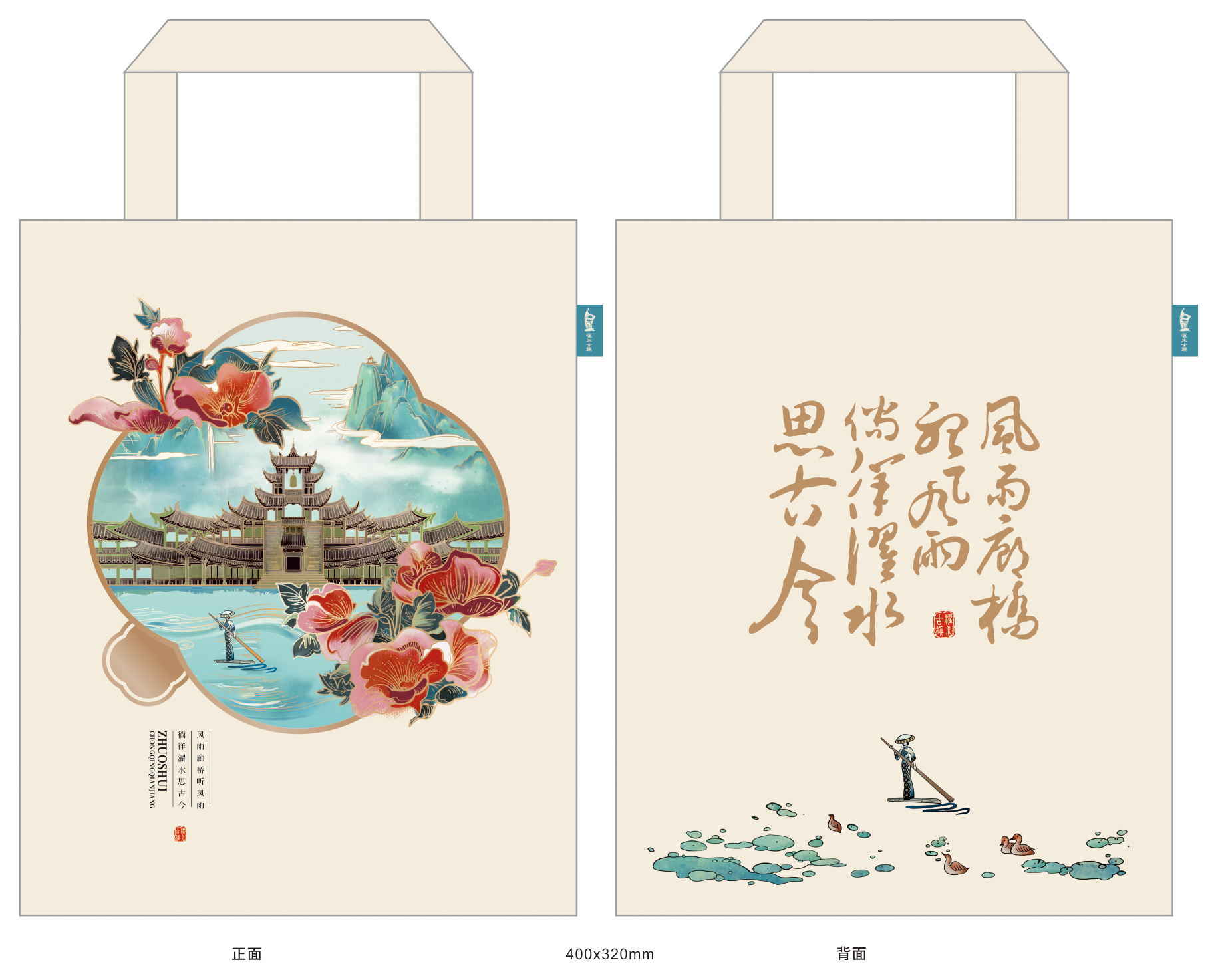 手繪風雨廊橋作包身圖案,緞面材質與黑金色結合應用,呈現月色光影映照之下造型各異的廊橋之美。